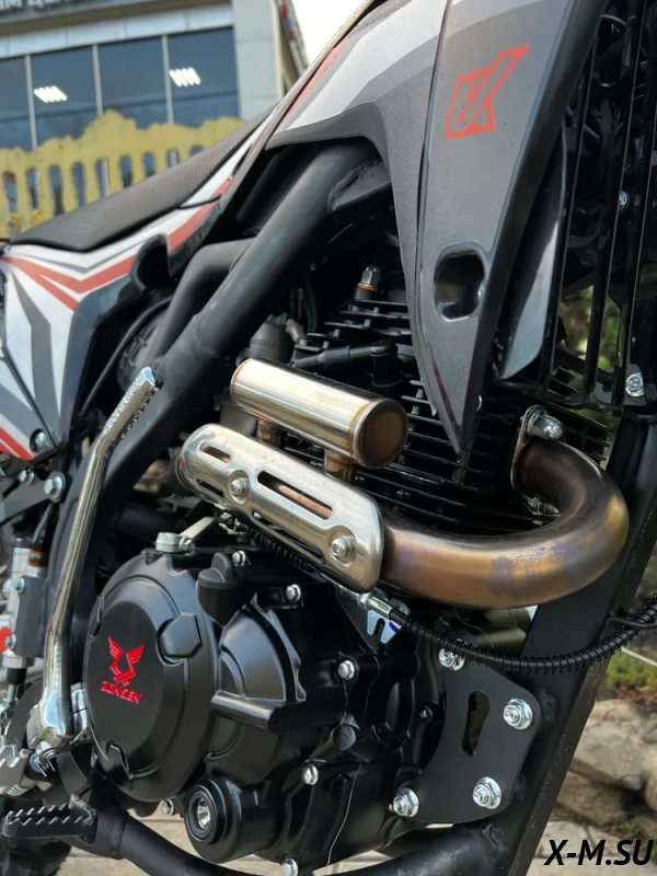 Оснащается Топовым оригинальным ZS 177FMN с высоким крутящим моментом в паре со спортивным карбюратором Nibbi Racing 30 идеально расположен внутри рамы. По сравнению с другими эндуро мотоциклами наклонен назад, это позволило распределить массу и получить лучшую управляемость.